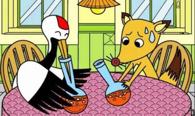 Na obrázku vidíme výjev ze známé pohádky O lišce a jeřábkovi. Zatímco jeřáb spokojeně konzumuje potravu z úzké baňky, liška jen závistivě nahlíží do nádoby, ze které se jí chutné jídlo nedostává.